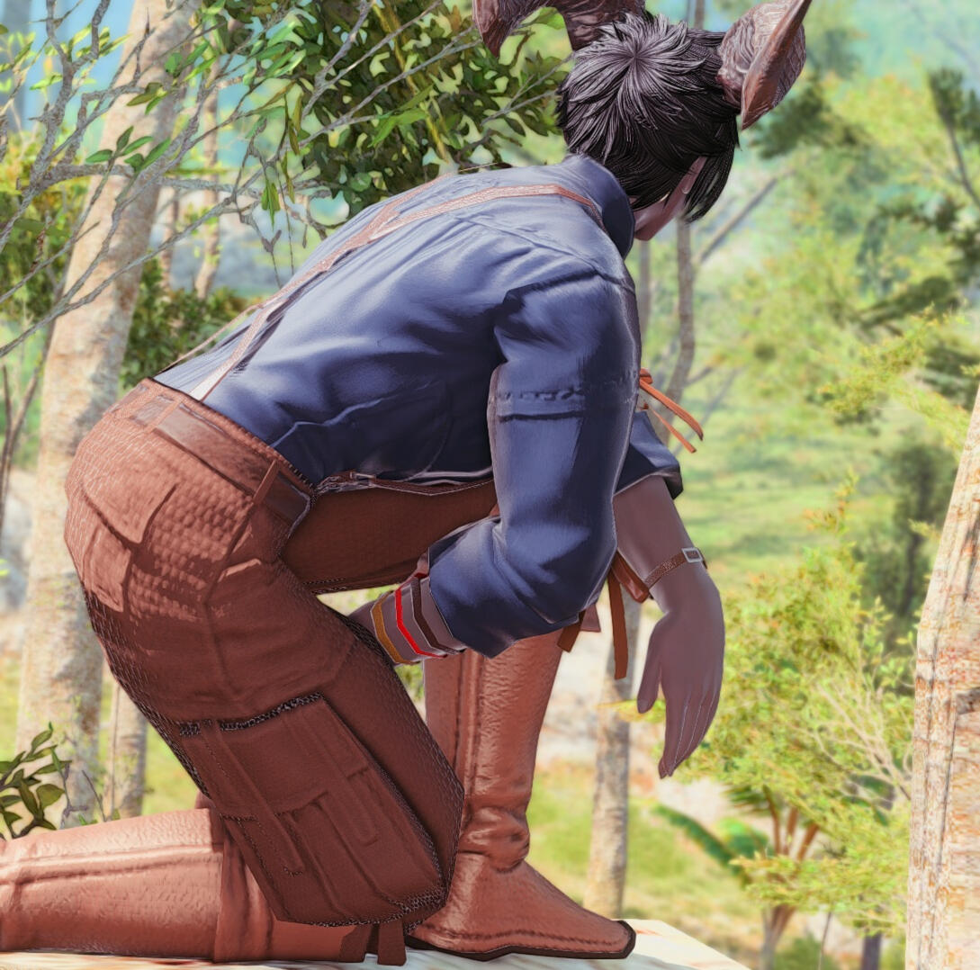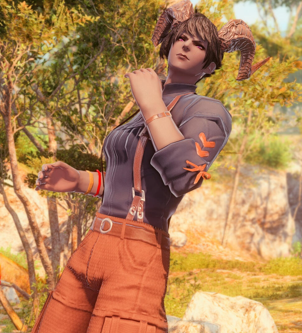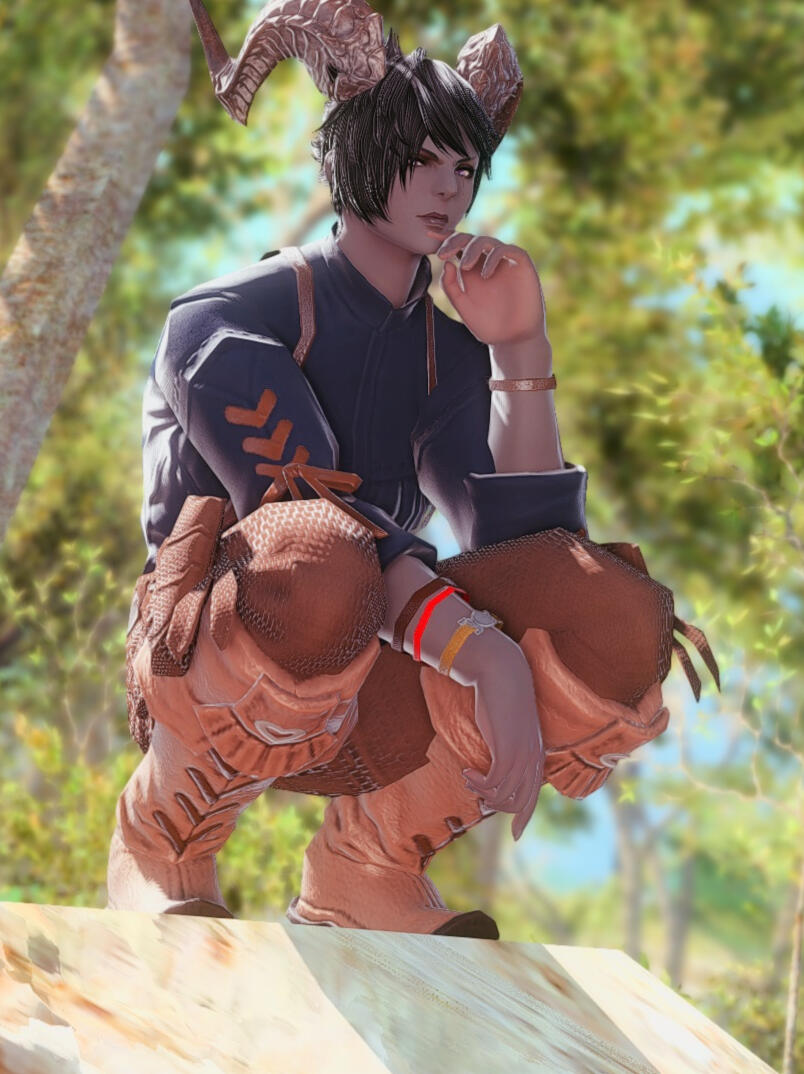 Bleiswyrd Ansamhawner was born to two unknown Roegadyn parents. The circumstances of her birth, as well as the reason for her abandonment are only known to her parents.Only for about three years was Bleiswyrd in the care of her parents. During which, she found herself being able to understand a lot of what her parents could say. Despite little in the way of education. But one night, during a carriage ride through the wilds of La Noscea, she was lost.Whether abandoned on purpose, or by accident, the result was the same, a small, three year old Roegadyn, alone in the forests of La Noscea. What should've been an untimely end, ended up becoming a saving grace for Bleiswyrd. As the small child wandered the woodlands, something found her first. Looming over her, a long armed behemoth with hundreds of razor sharp teeth. A goobbue. A creature which, to most small children, would spell doom, but when Bleiswyrd babbled at it, it made noises back. Noises Bleiswyrd, for some reason, understood. The tiny fragment of The Echo hidden deep within Bleiswyrd's soul, bestowed upon her, the ability to talk to this goobbue. The Goobbue, under most circumstances, would most definitely just devour the child, as it would anything that cannot outrun it. But this time, for some reason, maybe it was lonely, or lost a sproutling, or just was bored. The Goobbue, took in Bleiswyrd, and took care of it, raising it like a parent would.Due to a lack of a language barrier, they actually could form a bond, and have some lovely, albeit simplistic conversation. Thus was spent the next 13 years of Bleiswyrd's life. Living the life of a Goobbue, eating biomatter, devouring small animals, and standing idly in the sun.Eventually though, Bleiswyrd had to get out there, had to see the world. So, at the age of 16, Bleiswyrd gave a last hug to their guardian goobbue, and headed into civilization, but not before grabbing some leaves, plant fibers and old skins, and fashioning them into clothes. A naked, musclebound Roegadyn with horns walking into a city would certainly be an odd sight to behold.For the next few years, with help from her Echo, Bleiswyrd managed to somewhat adapt to the world she now found herself in. Doing odd jobs for money, her previous life of strenuous physical activity really ended up paying off in that regard. Eventually, Bleiswyrd became a part of a small crew of "Woodsmen and Woodswomen" as they called it. This job was stable, and actually allowed her to stay in a single spot for a while. During her work, she befriended an elderly Hyur man, who recounted his tales of being an adventurer, and attributed his long life to a blue crystal which apparently granted him mystical abilities. After a few years, the Hyur man was nearing his death, and gave Bleiswyrd the blue crystal, which, unbeknownst to her, was a soul crystal, the crystal of a blue mage. Now, Bleiswyrd doesn't really know how it works, and thus has gained only two abilities from it, one from a boar, and the other from a coerl, both of which her crew had to fight off to get them away from the logging site.Now Bleiswyrd does her day to day job, and lives her best life, sometimes paying visits to her Goobbue guardian, seeking to unravel the mystery of that blue crystal.After adjusting more to society. Bleiswyrd was recruited into a free company of fellow outdoorsy folk, known as the Faerie Forest. Where she resides in a room, sharing it with one of her woodsman friends, an enigmating, name-changing Namazu, who is currently known as Gyotsono. What Gyotsono wants with Bleis, is to be determined, but one thing is for certain. He has the vacant stare locked down.